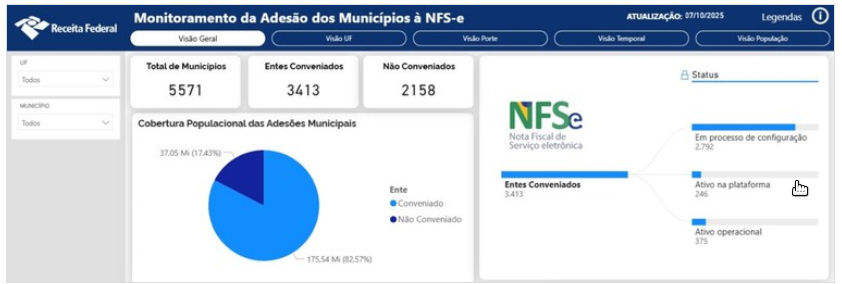 Para apoiar o monitoramento das adesões municipais, foi disponibilizado em 3 de outubro de 2025 um dashboard interativo, que apresenta um panorama detalhado da situação em todo o território nacional. O painel pode ser acessado pelo seguinte link: Monitoramento das Adesões à NFS-e — Portal da Nota Fiscal de Serviço eletrônica.